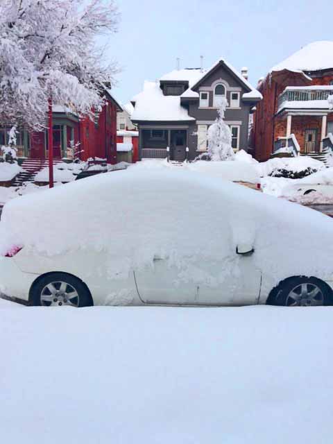 Snow-covered Prius shows depth from one-day storm in SLC.