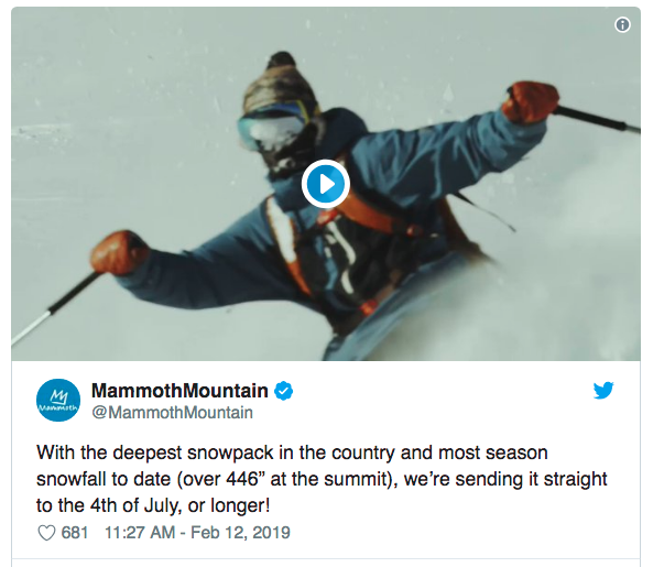 Squaw Valley has received 492″+  so far. That’s 41′; eight of them in the last week. Other California areas getting similar amounts. Boreal 432″; Kirkwood, 425″; Sierra at Tahoe, 400″.  Super snow storms are creating travel and avalanche issues.