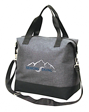 For $65 or more, you get a SeniorsSkiing.com tote bag, our top choice for the best way to keep all of your ski stuff in one, portable place, and to show your support for SeniorsSkiing.com. Made of durable, water-resistant polycanvas, it is 19.5” wide, 15” high, and expands by 7.5”. Use it to store and carry gloves, mittens, liners, hand warmers, sun screen, lip balm, extra tops and socks, a change of clothes, you name it. It has a good-sized zippered interior pocket to keep ski passes, cell phone, etc. The entire bag zips up to make a neat package for the back of the car or to carry on board. It features sturdy sewn hand straps and a clip-on nylon shoulder strap.