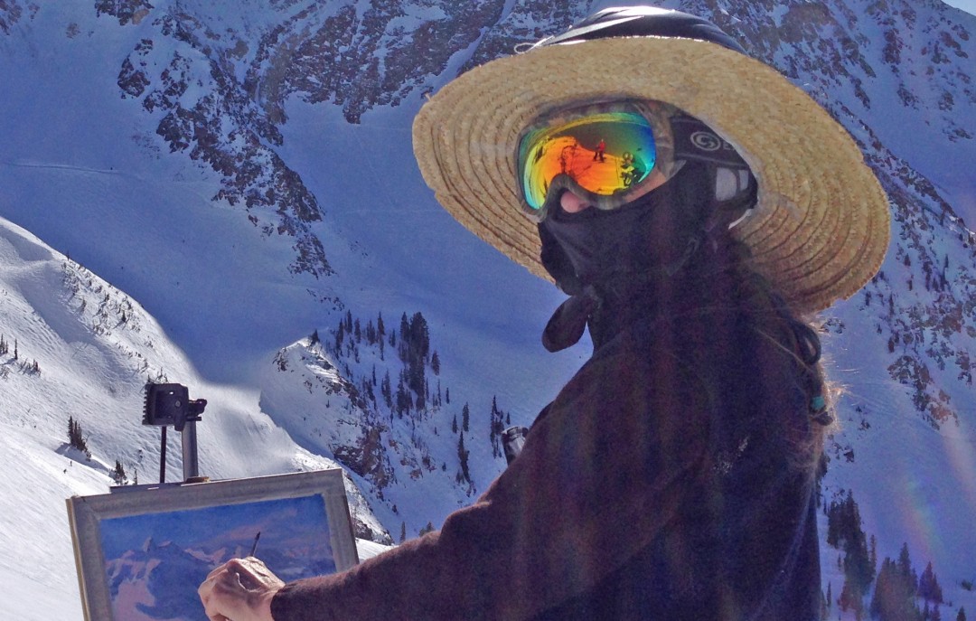 Here’s Judy Calhoun capturing a scene on canvas at the top of an Alta run.