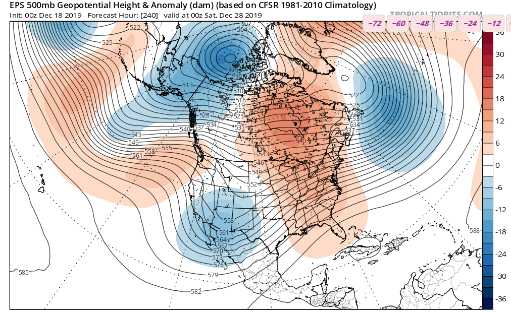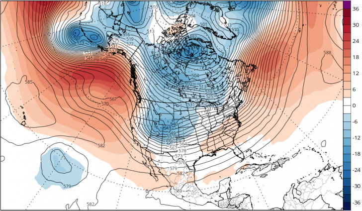 The changes are substantial. The ridge is stretched out across the far northern latitudes, with an extension over the northeast Pacific. The clockwise circulation around the ridge will help access cold in the Yukon. A deep trough over eastern North America is poised to receive the cold and spawn surface storms.