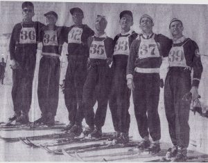 The photo was taken in Sun Valley, ID at the base of the old Ruud Mountain Ski Jumping Hill in February 1941. In the photo are, left to right: Corey Engen, Barney McClean, Sverre Engen, Gordon Wren, Alf Engen, Torger Tokle, and Art Devlin. Not long after this photo was taken, the great ski jumper, Torger Tokle, went into the military service, joining the 10th Mountain Division at Camp Hale and ultimately lost his life in combat during WWII. Torger and Alf father were two of the greatest U.S. ski jumpers of that time period.