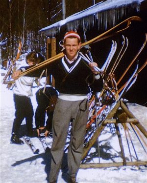 In the fall, we bought ski gear: wooden skis, cable bindings, leather boots, and bamboo poles. State of the art stuff. I had my favorite ski clothes, including the Norwegian striped cardigan I had been using since 1953; Judy bought a spiffy new outfit (maroon ski pants and grey jacket) that she occasionally still uses.