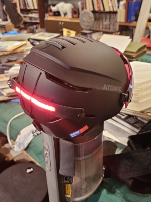 Now about that idea. Going along with my safety schtick, I am working on a red-light system to go onto the back of my helmet. This might be over the top but as in my earlier drawings for skier safety I included lights on my jacket. Let’s see how this works this year!!!