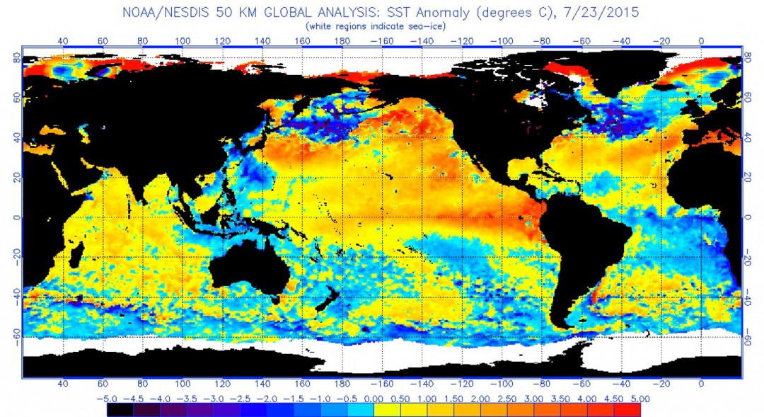 The latest (July 15th) word from NOAA (National Oceanic and Atmospheric Administration) and other weather watchers is that the El Nino currently growing off the west coast of South America is gaining intensity. El Nino is the weather phenomenon that occurs when Eastern Pacific waters are warmed through a combination of factors, starting with increased cyclones in the Indonesian archipelago, the reversal of the trade winds from easterly to westerly off South America, and the resulting flood of warm Western Pacific waters eastward. This has an direct impact on our weather and, in fact, weather around the global.