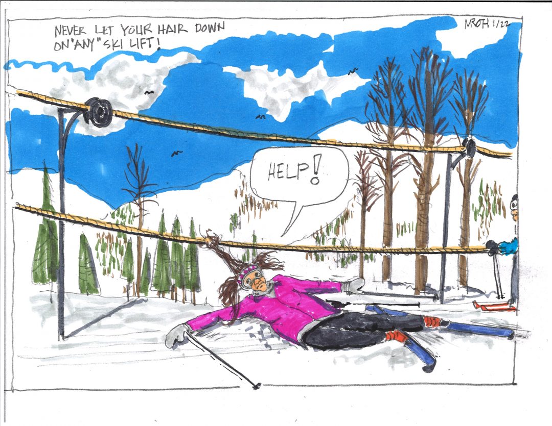 Editor’s note: Virtually all of us have amusing or near-miss skiing stories. Send in your stories and we’ll publish the most interesting…along with an original Mike Roth cartoon depicting the event.