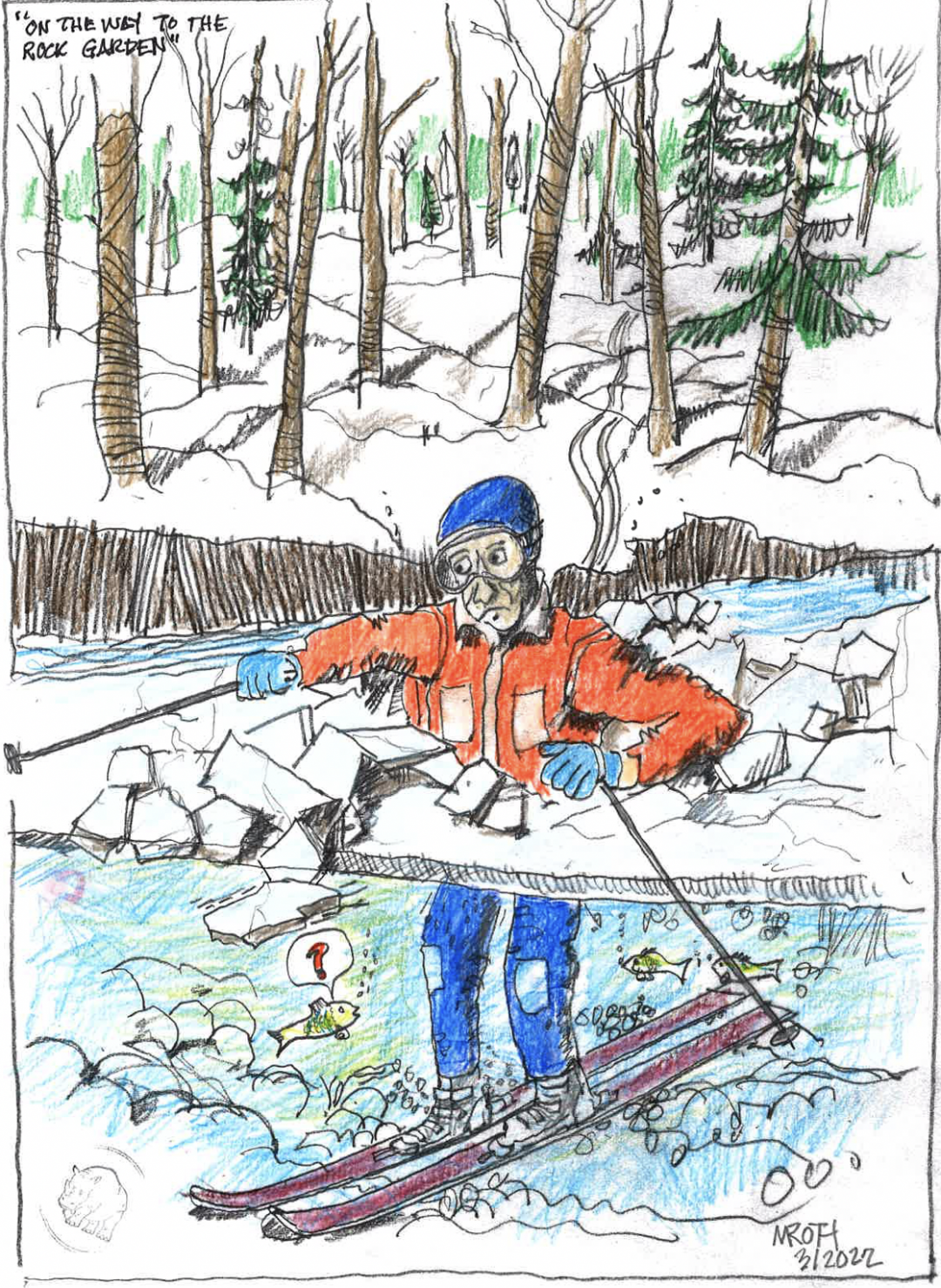 Nice story, great drawing, loved the little goldfish, horrible experience for the guy in the river. Even a shallow stream is unpleasant because you can get very wet and cold if you crash into a few inches of water (thank you hidden tree stump!) and if you just paddle across it onto the bank the snow immediately freezes on your wet skis and boots and you end up walking along with huge canoes of wet snow freezing onto your skis and boots and you have to take the skis off and try to scrape off the ice on tree-trunks and branches if you don’t have a scraper of some kind. You can’t start the skis sliding again until you have cleaned and dried the ski base of all the ice and water. Then you want to get back to base to dry out and warm up. If it is a long way back to civilisation you could be at real risk of dying of exposure if you are on your own in bad weather but your buddies want to keep on skiing and you know they are cursing you and hoping that they are not the ones who have to get you back to base even if they don’t say anything and that is your ski day done anyway (who takes spare boots on holiday?) Depending on how bad the actual circumstances are, calling Ski Patrol might be the safest if most galling option! I was lucky enough to be at the edge of the wood at the top of linked blue runs back to base and not too wet on a -8C day with a bit of sun showing so I just waved goodbye and squelched back to my room for a hot shower and spent the rest of the day in communion with a tumble dryer for my clothes and a hair dryer for my boots.