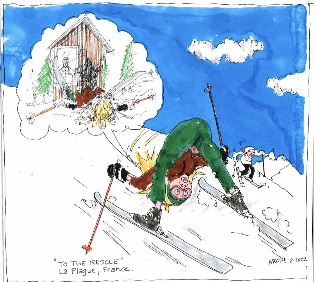 Editor’s note: Virtually all of us have amusing or near-miss skiing stories. Send in your stories and we’ll publish the most interesting…along with an original Mike Roth cartoon depicting the event.