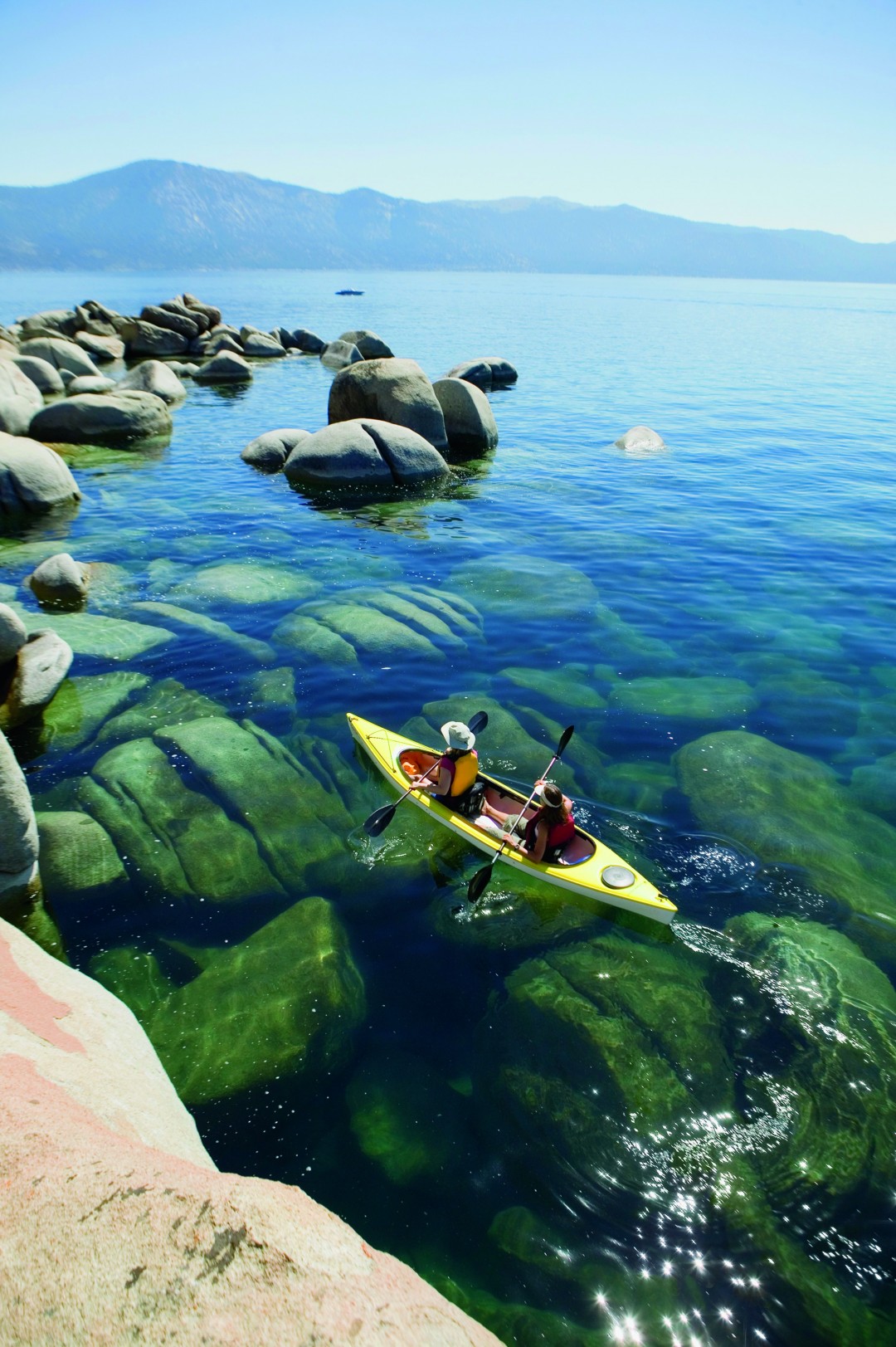 Kayaking is a great upper-body workout for skiers in the off-season and especially relaxing on the calm waters of Lake Tahoe, one of the clearest lakes in the world with water clarity of more than 70 feet. Credit: The Ritz-Carlton, Lake Tahoe