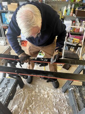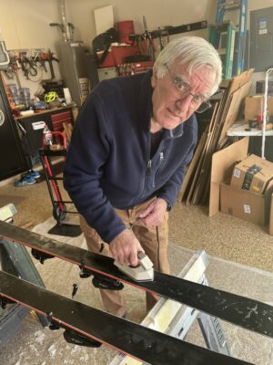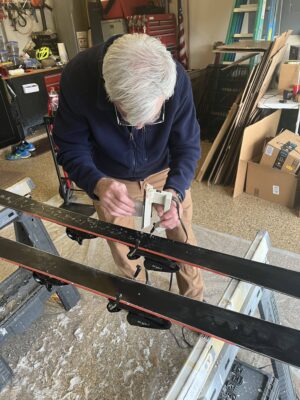 Decades ago, I waxed four pairs of skis for the family. Ski vises weren’t very common so I traced the front and heel of a ski boot and built an adjustable ski holder, just like stepping into the ski with your boot but upside down. A short time later a similar item came on the market made of plastic.