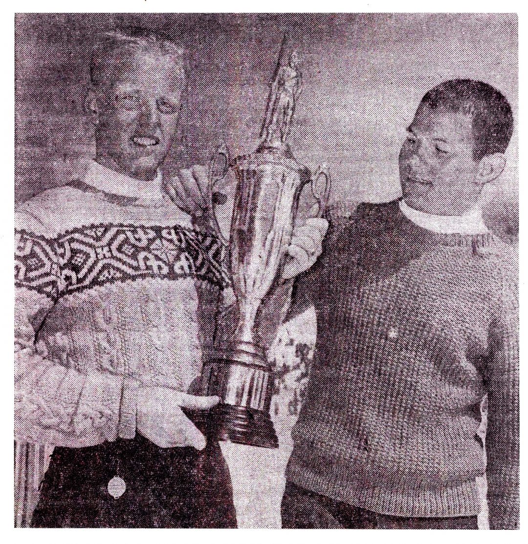 Alan Engen (l) and Jim Gaddis hold the Intermountain Ski Association Alpine Combined trophy. Each won the championship 3 times. c. 1959. Credit: Alan Engen Collection