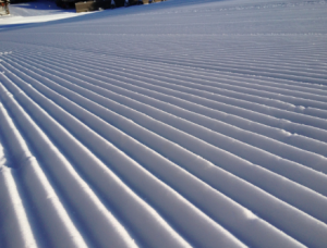 Corduroy creates a strong, stable surface if it’s in place long enough before being used. In addition to faster set-up time (“mechanical age hardening”) and increased snow metamorphism, the triangular shape of the individual ridges adds strength and stiffness. Ideally, corduroy peaks form a thin glaze that extends about 1/3rd of the way down the trough, in effect building a little ice cap. With a well-distributed load, these caps are the first defense against trail flattening, friction, and melt.