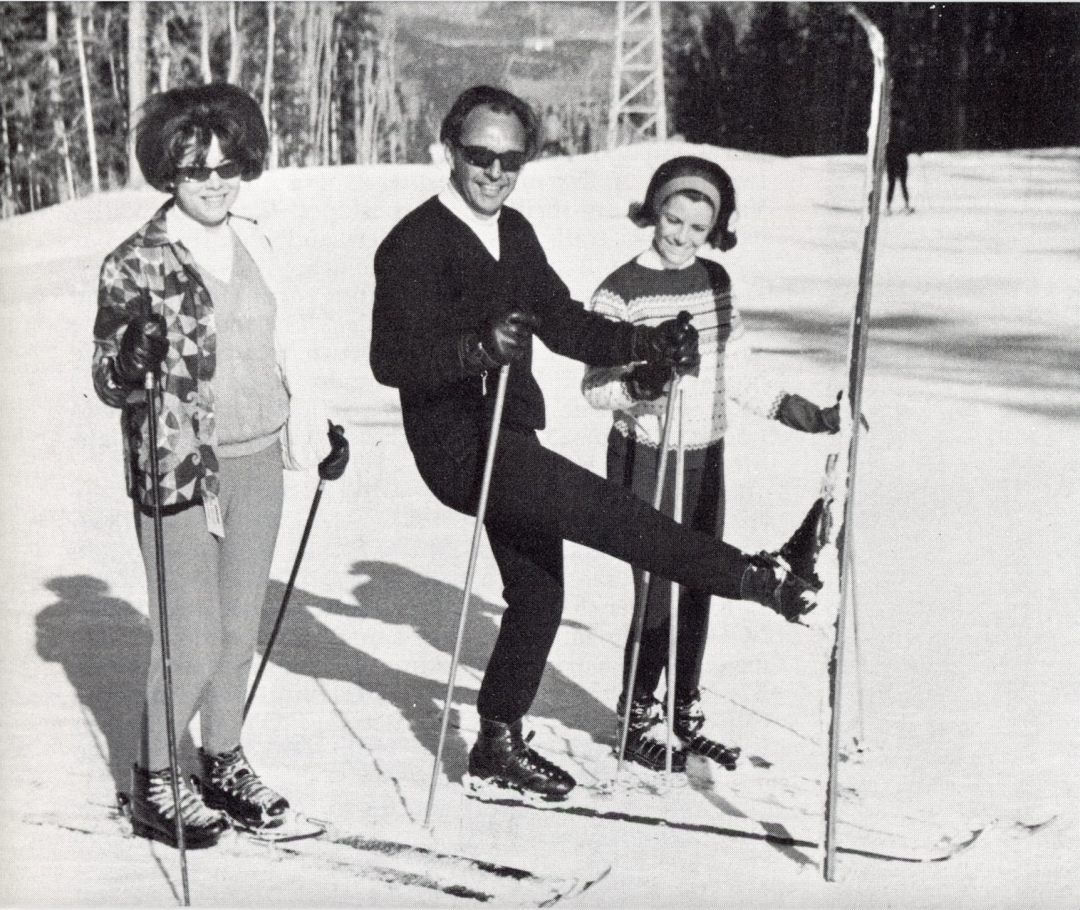 The hairdo’s scream late 1960s. But these co-eds weren’t the only students of the man in the middle. He trained members of the US men’s and women’s Olympic ski teams and went on to write books on finding inner peace. What is his name and what is the name of the area where this picture was taken? One clue: it was submitted by the New Mexico Ski Museum and Ski Hall of Fame.